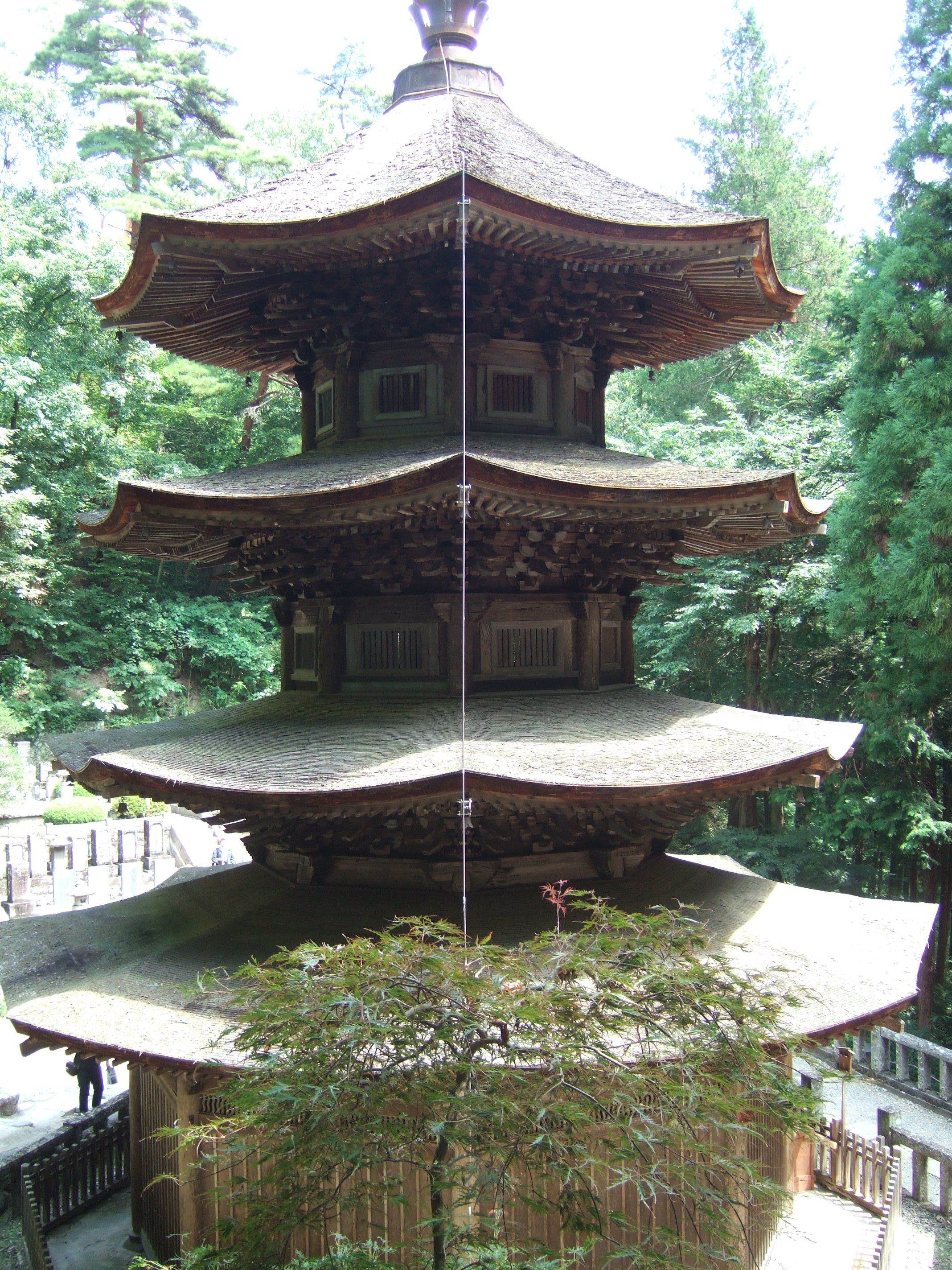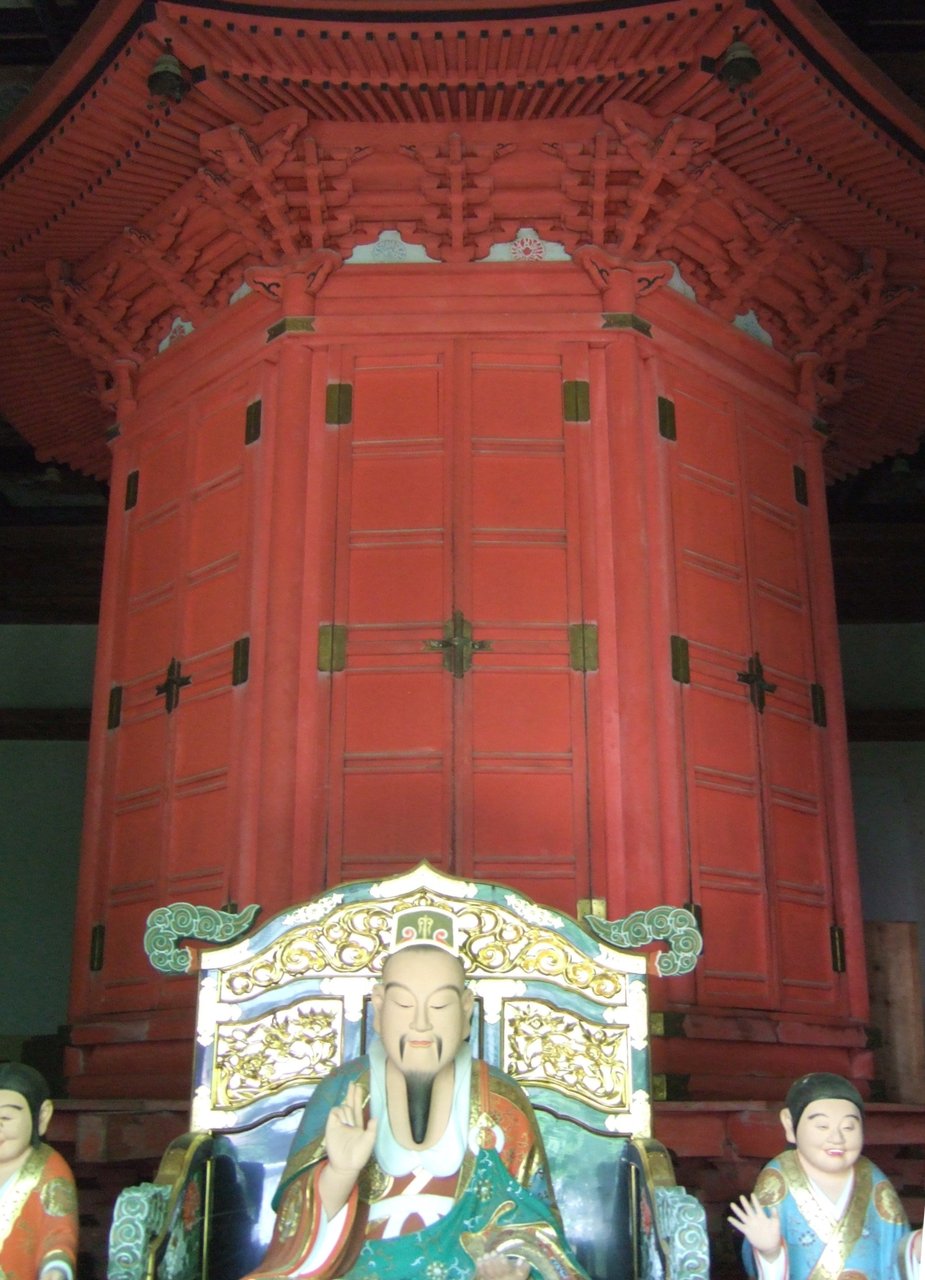そこで境内の奥に足を踏み入れてみて、得心をしたわけである。八角三重塔へ向かう本堂の脇に経蔵があったが、方三間のぬりこめ、宝形造り、銅版葺きの建物のなかに、八角形の朱塗りの輪蔵(回転式の経典書棚)が収められていた。その経典こそが、寛政5年(1783)に、宇治の萬福寺から購入した黄檗版鉄眼の一切経というではないか。 したがって当山は曹洞宗というものの黄檗宗の色合いの濃い禅寺とみなすこともできるのではないかと、思ってみたりしたのである。庫裡の一風変わった屋根型、そして山道を少し登ったところに屹立する八角三重塔の純粋な禅様式を見るにおよび、この寺はやはり遠い鎌倉の時代から中華の先進文化を貪欲に吸収するDNAのようなものを、そもそも身内に内在させた不思議な寺なのだと思ったのである。